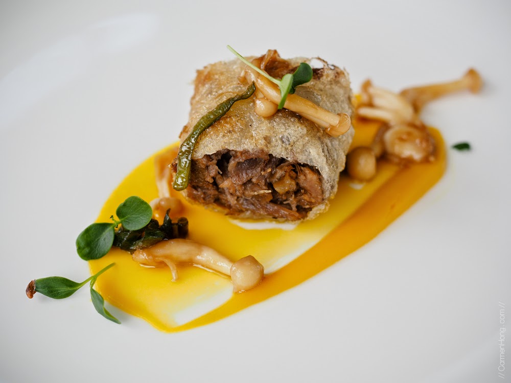 In Muscovy Duck “Spring Roll” for the gentleman, crispy Vietnamese rice paper was used to wrap a Muscovy Duck Confit. This was then served with sautéed Shimeji mushrooms and Shishito Japanese green chili, with Roasted Butternut Squash Puree glazed along the dish. The Muscovy duck was Chef Eugene’s choice because of its bigger size compared to others. This breed of duck is usually found overseas, but there is a local producer based in Ipoh who rears these ducks free-range making for leaner yet tender meat.