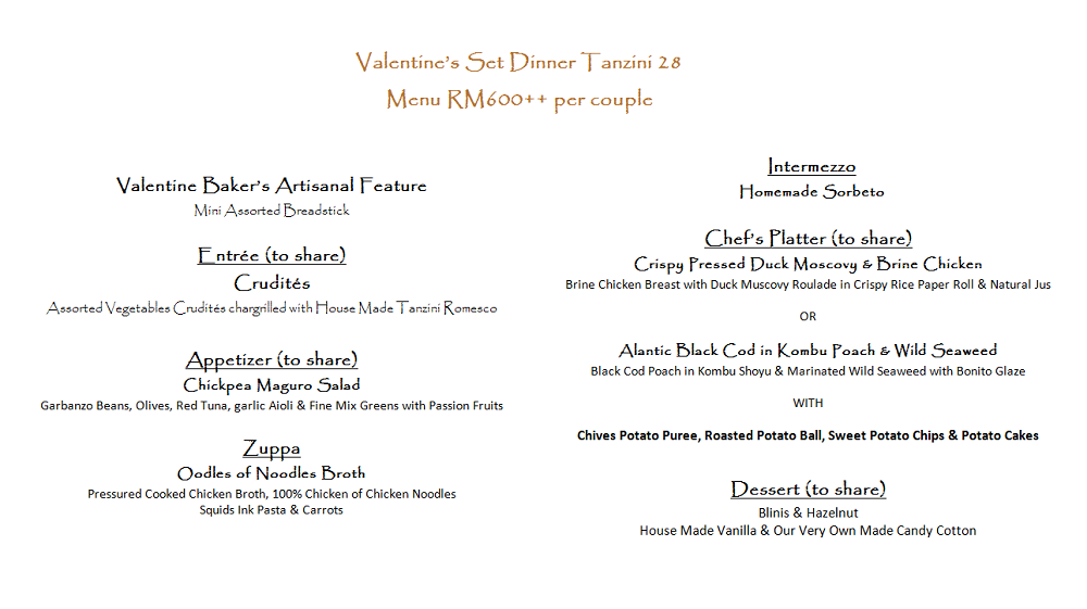 Other than the menu above, Tanzini’s Lower Deck also has their own Valentine’s Menu which is priced at RM600++, with a different menu (see below for the menu).